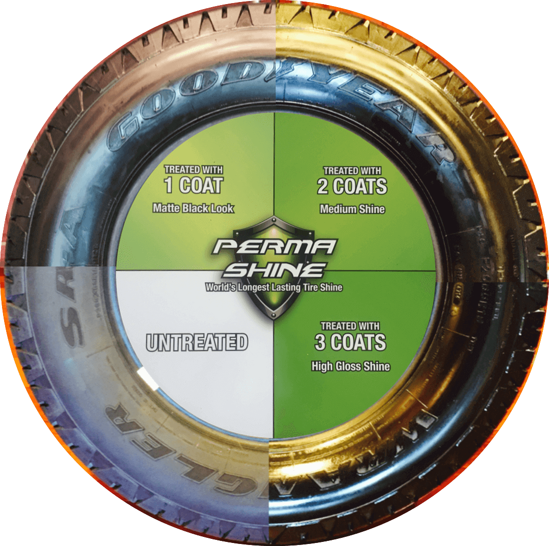 Perma shine Tyre shine clear coat dries in minutes and lasts for months. Each 4 OZ bottle will cover approximately 4-6 tyres Multiple times. It contains no silicone; it’s Safe to use around a body shop.